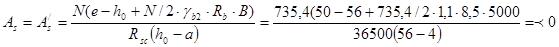 При расчете сечения в первую и вторую комбинации усилий расчетное сопротивление Rв следует вводить с коэффициентом γb2=1,1 так как в комбинации включена постоянная, снеговая, крановая и ветровая нагрузки; на третью с коэффициентом γb2=0,9 (постоянная и снеговая). Расчет должен выполнятся на все три комбинации, и расчетное сечение арматуры должно приниматься наибольшее. Так как изгибающие моменты по абсолютному значению в этих комбинациях не очень отличаются друг от друга, подкрановую часть армируют симметрично (Аs=AsI). Ниже дан расчет сечения по первой комбинации.
